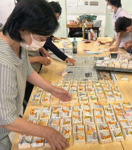 石けんは7月から製造を開始。廃油にカセイソーダと水を加え、豆腐の空容器に流し込んで約2週間乾燥して固めた後、丁寧にラッピングし、SDGsのメッセージカードを添えて配布した。