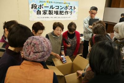 JAひだは1月下旬、下呂市のJAひだ萩原支店で、生ごみを発酵させて堆肥にする「段ボールコンポストによる自家製堆肥づくり講座」を開いた。講師は市民グループ「下呂市女性きらめきの会」のメンバーで、JAの支店運営委員や職員など約40人が参加した。