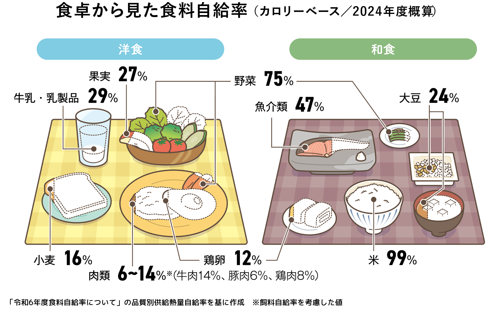 日本の食料自給率は約4割。私たちが普段口にする食べ物の約6割は外国からの輸入に頼っています。もし輸入が止まってしまったら、私たちの食事はどうなってしまうのでしょうか。普段の食卓から日本の食料自給率について考えてみましょう。