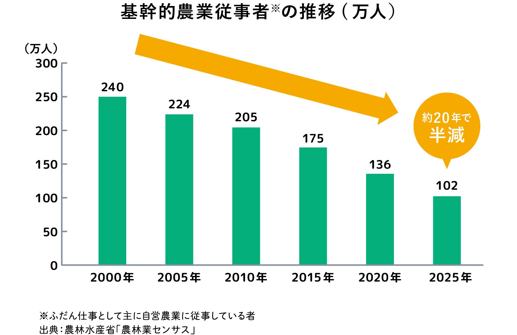 農業を主な仕事とする基幹的農業従事者の数は、2025(令和7)年時点で102万人で、2005年の224万人と比べると、約20年間で半減しています。さらに、農業従事者の高齢化も大きな問題となっており、今後さらに減少していくことが見込まれています。このままでは、さらなる食料自給率の低下も懸念されています。