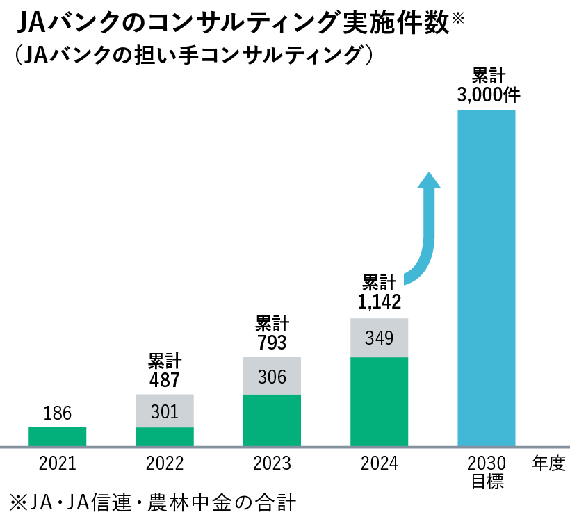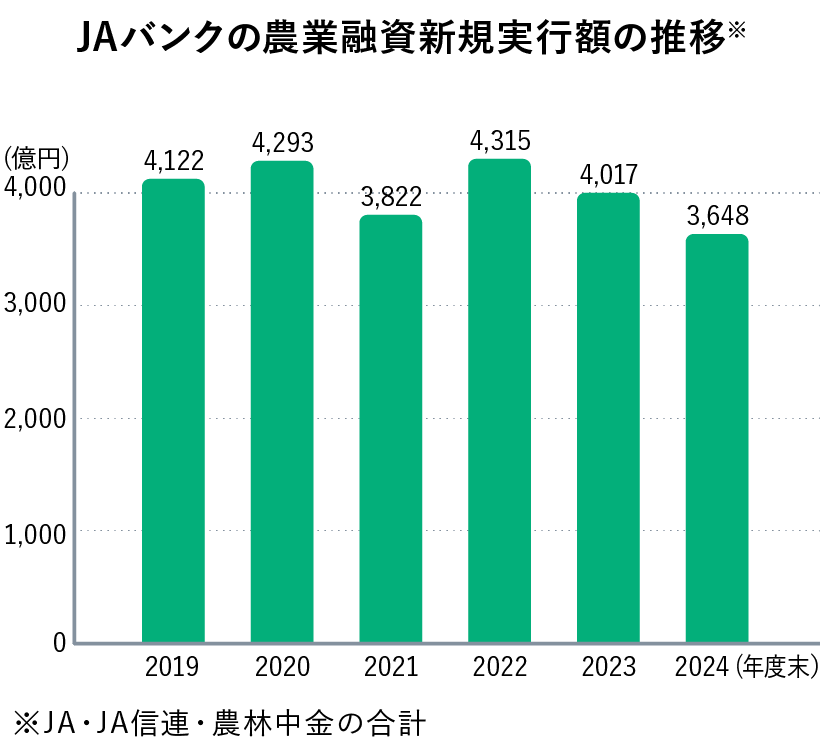 JAバンクは家族経営から大規模農業法人まで、幅広い農業者を支援しています。融資・出資、経営コンサルティング、食農バリューチェーン構築支援などを通じて、所得向上や生産基盤強化、持続可能な農業の実現を目指しています。国内農業融資では最大の貸し手として重要な役割を担っています。