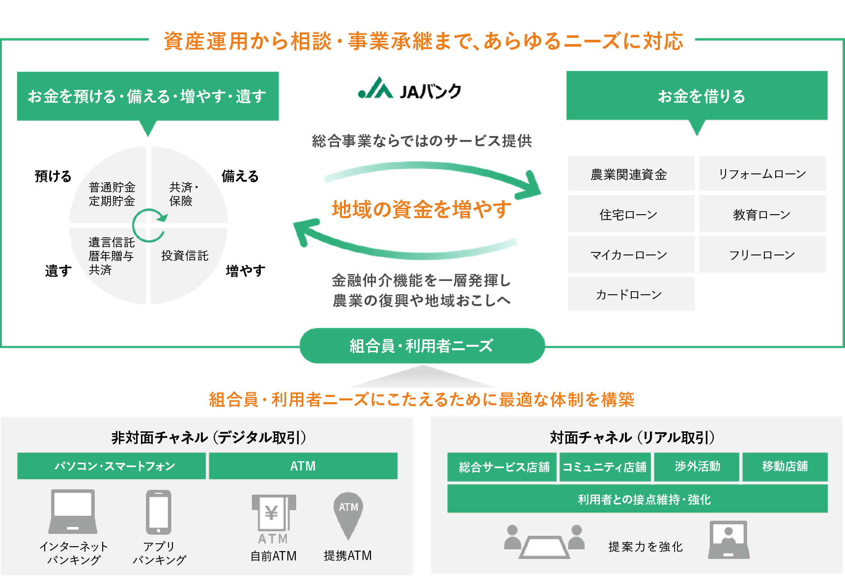 JAバンクは組合員・利用者のライフイベントに応じて、貯金・決済・ローン・投資信託などの金融サービスを提供しています。個々の課題やニーズに対応するため、経営課題やライフプランの可視化によるニーズ発掘、総合的なサービス提供、そしてJAバンクアプリなどのデジタル取引手段の拡大に取り組んでいます。